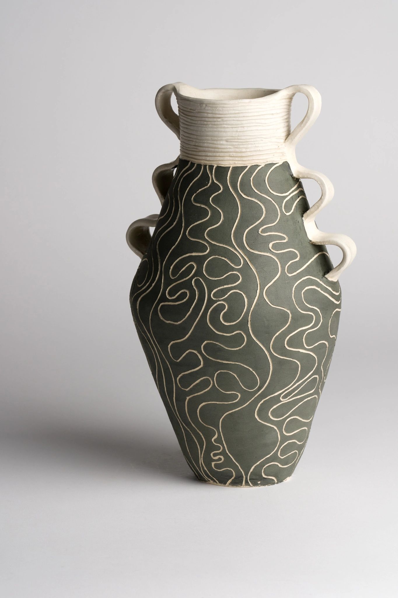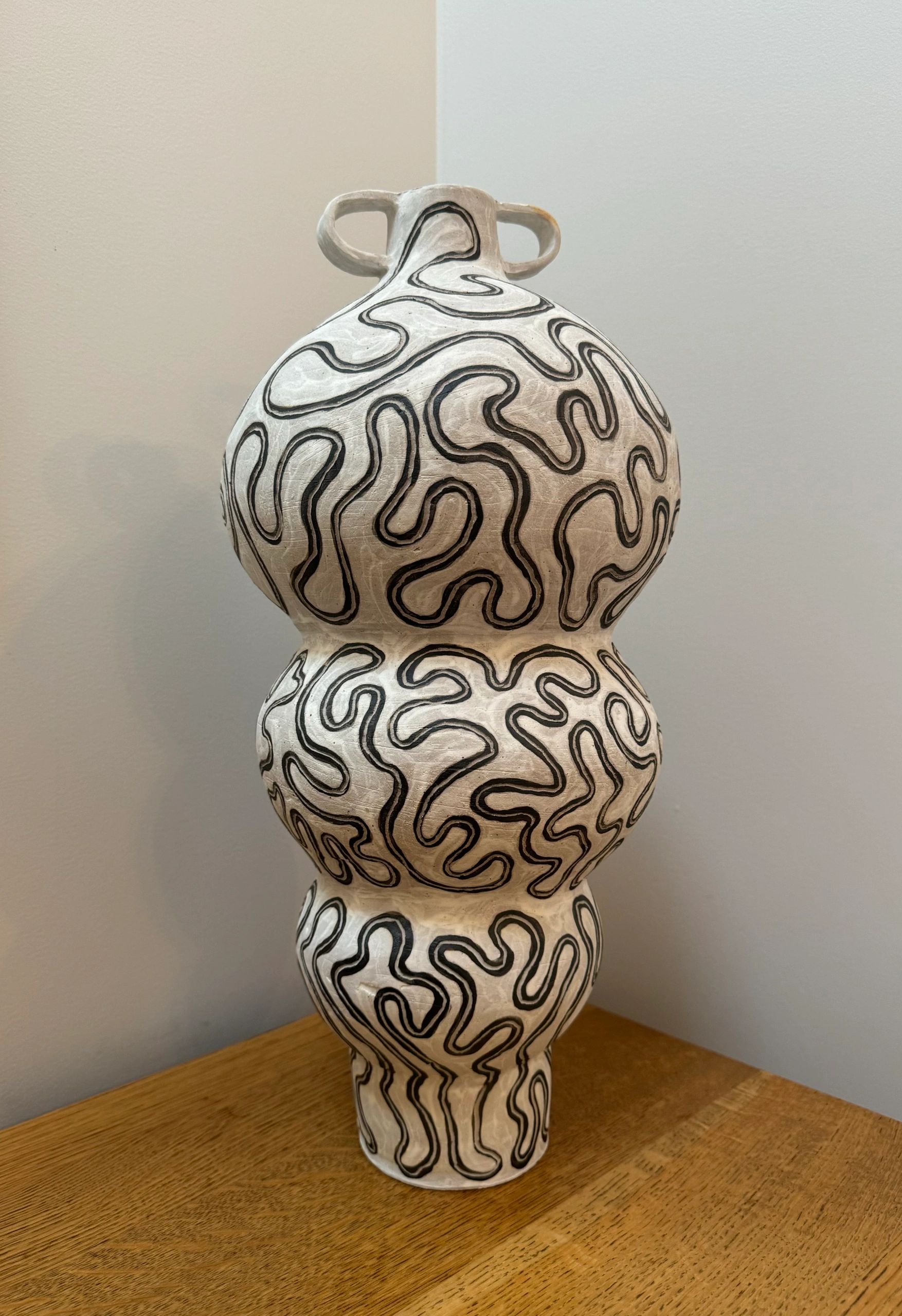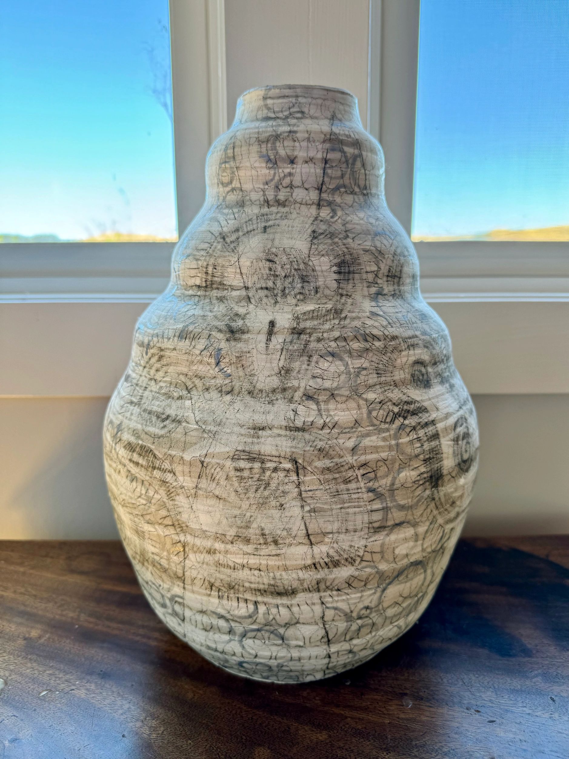 These pieces are one of a kind. They collaborate with me in a kind of call and response dance! After the form is established and fired... I sit with them until we - together - find a path to completion. I draw, paint, add, subtract, carve, layer, using glazes and under glazes. They are high fired and permanent.